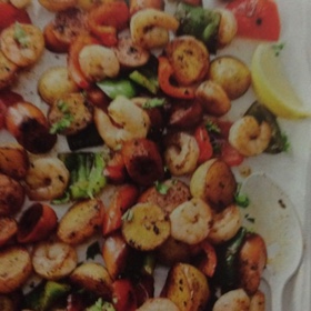 On prepared pan. toss together potatoes, red pepper, green pepper, 3 tbsp of the oil, Cajun seasoning, paprika, salt and pepper. Bake until potatoes are almost tender, 15 to 18 minutes.