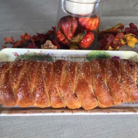 When cycle is finished, remove dough and cut into two pieces. Cut each of the two pieces into three pieces for braids. Braid dough and shape. Let rise until about double.
