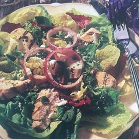 Cut chicken into 1/2-inch thick slices. Separate onion into rings. In bowl, toss together chicken, onion, salad greens and war vinaigrette until coated. Serve sprinkled with feta cheese and remaining basil and oregano.