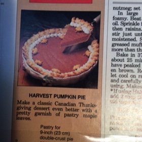 Bake pie and reserved pastry leaves in 425°F oven for 15 minutes, removing pastry leaves when lightly browned, Reduce heat to 350°F and bake for about 45 minutes longer or until tester inserted in centre comes out clean. Let cool. Garnish with reserved pastry leaves. Pipe whipped cream decoratively around leaves.